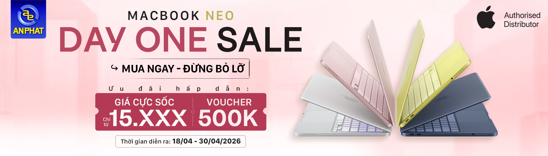 MacBook từ lâu luôn được xem là dòng laptop cao cấp dành cho người dùng yêu thích sự tinh tế trong thiết kế, độ ổn định trong vận hành và trải nghiệm sử dụng mượt mà bền bỉ theo thời gian. Với MacBook NEO, khách hàng tiếp tục có thêm một lựa chọn hiện đại, tối ưu cho học tập, công việc và nhu cầu di chuyển linh hoạt mỗi ngày. Từ ngày 18/04 đến 30/04/2026, An Phát Computer triển khai chương trình DAY ONE SALE MACBOOK NEO, tặng ngay voucher 500.000 VNĐ cho khách hàng mua máy, áp dụng trên toàn hệ thống.
