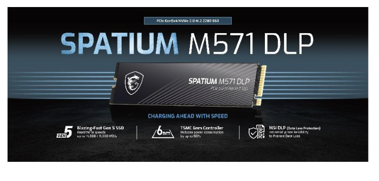 MSI chính thức giới thiệu SPATIUM M571 DLP SSD, mẫu SSD flagship sử dụng giao tiếp PCIe Gen5, mang lại tốc độ đọc/ghi siêu nhanh lên đến 14.000 / 11.000 MB/s. Sản phẩm được trang bị controller tiến trình 6nm của TSMC, giúp giảm mức tiêu thụ điện năng lên đến 50%, đồng thời tích hợp công nghệ Data Loss Protection (DLP) độc quyền của MSI, đảm bảo an toàn dữ liệu quan trọng trong các tình huống mất điện đột ngột.