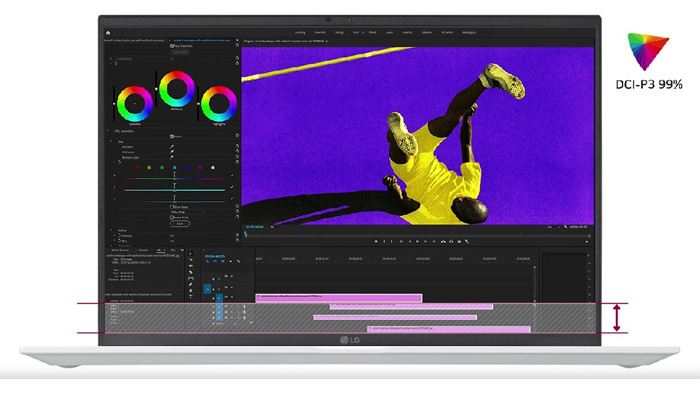 Màn hình của LG gram được thiết kế với tỷ lệ khung hình 16:10, kích thước 17Inch, độ phân giải WQXGA(2560 x 1600) hỗ trợ gam màu rộng DCI-P3 99%, cho phép bạn xem được nhiều nội dung hơn mà không phải cuộn màn hình. Thêm vào đó, hình ảnh hiển thị trên tấm nền IPS chống lóa (Anti-Glare) cùng với độ sáng màn hình lên tới 350nits, giúp bạn thoải mái làm việc hay thưởng thức các thước phim giải trí ngoài trời hay tại những nơi có cường độ ánh sáng cao.