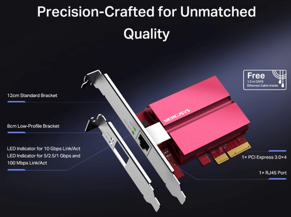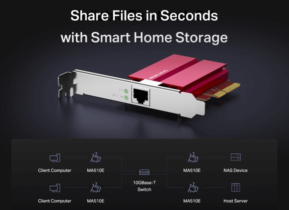| Quy cách đóng gói | - 10 Gigabit PCIe Network Adapter (MA510E)- Standard/Low-Profile Brackets- Quick Installation Guide- Resource CD- Dây mạng CAT6 dài 1.2m |