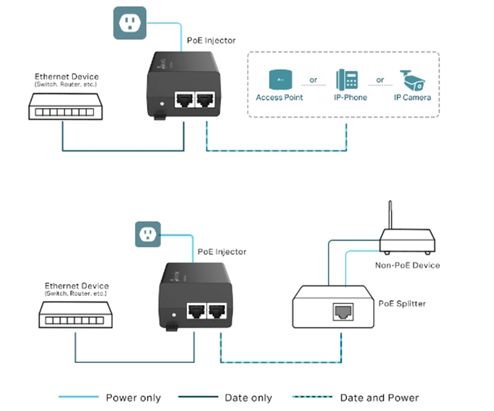 | Tính năng cơ bản | • Auto-Sensing Algorithm enables providing power with 802.3af/at PD • Auto-determine the necessary power requirements • Wall-mounting and desktop installation supported • Plug-and-Play |