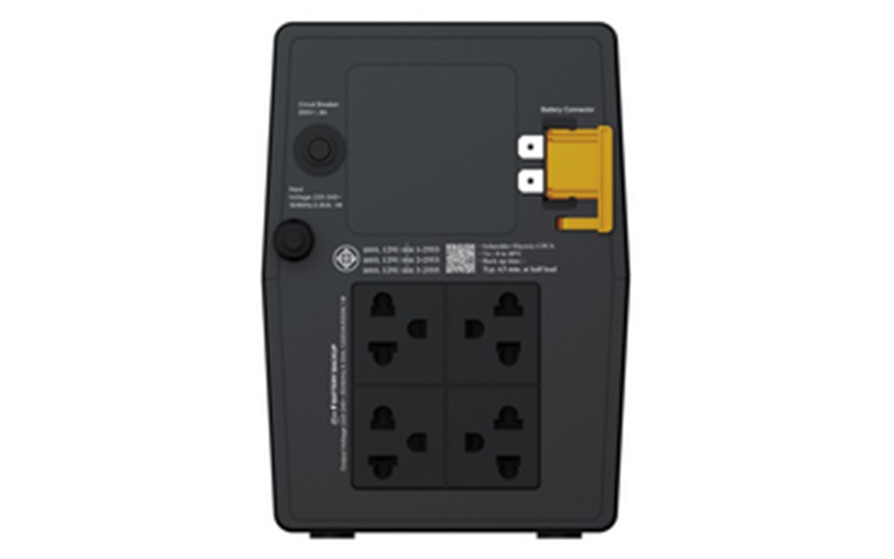 UPS được trang bị 4 ổ cắm Universal, cho phép kết nối linh hoạt với nhiều loại phích cắm khác nhau. Bảng điều khiển LED Status hiển thị trạng thái hoạt động (Online / On Battery) trực quan, giúp người dùng dễ dàng kiểm soát tình trạng nguồn điện.