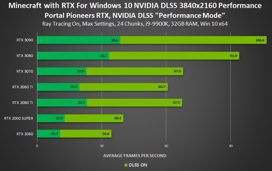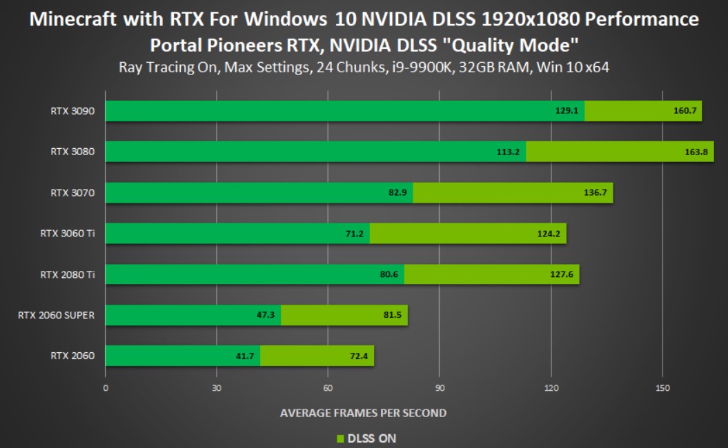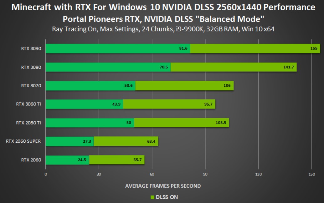 Một bước phát triển lớn khác là trò chơi sandbox phổ biến Minecraft với RTX hiện đang chuyển từ bản beta sang bản phát hành chính thức. Minecraft với RTX sử dụng DLSS và dò đường cho tất cả các tia trong cảnh. Một số thế giới Minecraft chọn lọc cũng cho phép gói kết cấu Kết xuất Dựa trên Vật lý đặc biệt để tăng cường thêm cảnh. Thế giới RTX của Portal Pioneers trong trò chơi đóng vai trò như một điểm chuẩn được tích hợp sẵn.