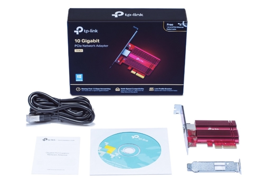 | Sản phẩm bao gồm | Bộ chuyển đổi mạng PCIe 10 Gigabit (TX401) Chân đế tiêu chuẩn / cấu hình thấp Hướng dẫn cài đặt nhanh CD nguồn Cáp Ethernet 1.5 m CAT6A |
