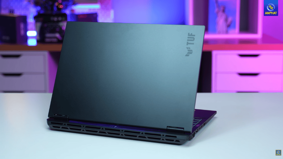 Mặt A kim loại: Mang lại cảm giác sờ mát lạnh, cao cấp và ít bám vân tay. Logo TUF được khắc tinh tế ở góc.