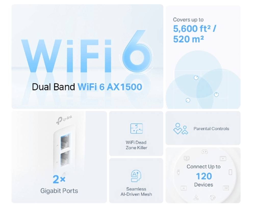 | WiFi Speeds | AX1500 5 GHz: 1201 Mbps (802.11ax) 2.4 GHz: 300 Mbps (802.11n) |