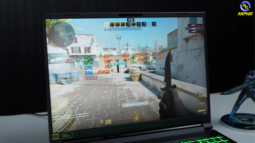 Đi cùng CPU là card đồ họa rời AMD Radeon RX 5060 8GB, mang lại khả năng xử lý đồ họa mạnh mẽ, chơi mượt các tựa game AAA ở mức thiết lập cao. Bên cạnh đó, Nitro V 16 còn được trang bị iGPU Radeon 860M, cho phép người dùng tận hưởng trải nghiệm gaming ngay cả khi sử dụng chế độ tiết kiệm điện năng. Thử nghiệm thực tế cho thấy, với tựa game CS2 chạy trên iGPU ở độ phân giải 2.5K Medium, FPS vẫn duy trì ổn định, đảm bảo tính mượt mà.