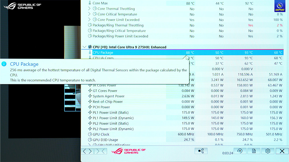 Trung tâm của ROG Strix G18 là bộ xử lý Intel Core Ultra 9 Processor 275HX, sở hữu 24 nhân – 24 luồng, xung nhịp tối đa lên đến 5.4GHz cùng bộ nhớ đệm 36MB. Đây là CPU laptop mạnh nhất của Intel ở thời điểm hiện tại, đem lại hiệu năng vượt trội trong cả gaming lẫn công việc nặng như render, dựng phim hay chạy mô hình AI. Nhờ thân máy to nên khả năng tản nhiệt của ROG STRIX G18 là rất tốt, thể hiện khi chạy Cinebench con Core Ultra 9 này thậm chí còn chưa đạt ngưỡng 90 độ như nhiều con chip HX khác.