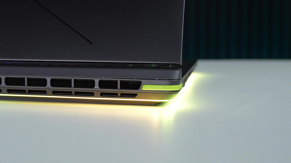 Dải LED gầm RGB chạy quanh toàn thân máy càng làm chiếc G18 trở nên bắt mắt, ánh sáng lan đều xuống mặt bàn tạo hiệu ứng rực rỡ và hiện đại – đúng chất của một chiếc laptop gaming cao cấp.