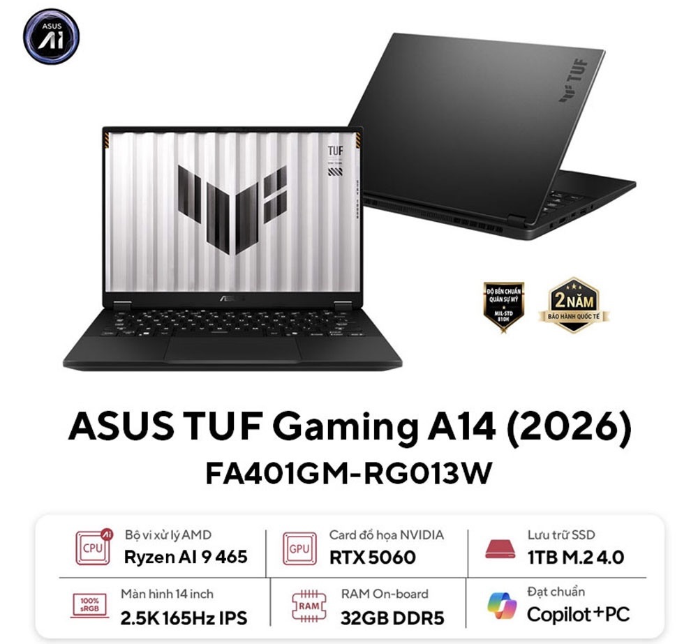 Laptop ASUS TUF Gaming A14 FA401GM-RG013W là mẫu laptop gaming cao cấp được thiết kế dành cho game thủ và người dùng cần hiệu năng mạnh mẽ trong một thân máy nhỏ gọn. Sở hữu vi xử lý AMD Ryzen AI 9 465 tích hợp NPU AI mạnh mẽ, card đồ họa RTX 5060 8GB GDDR7, màn hình WQXGA 165Hz sắc nét cùng bộ nhớ 32GB RAM LPDDR5X, chiếc laptop này mang lại trải nghiệm chơi game, làm việc sáng tạo và xử lý AI vượt trội. Thuộc dòng ASUS TUF Gaming nổi tiếng về độ bền và hiệu năng, A14 FA401GM-RG013W không chỉ mạnh mẽ mà còn có thiết kế gọn nhẹ chỉ 1.46kg, giúp người dùng dễ dàng mang theo mọi nơi. Đây là lựa chọn lý tưởng cho game thủ, lập trình viên, nhà sáng tạo nội dung và những ai cần một cỗ máy hiệu năng cao trong kích thước 14 inch linh hoạt.