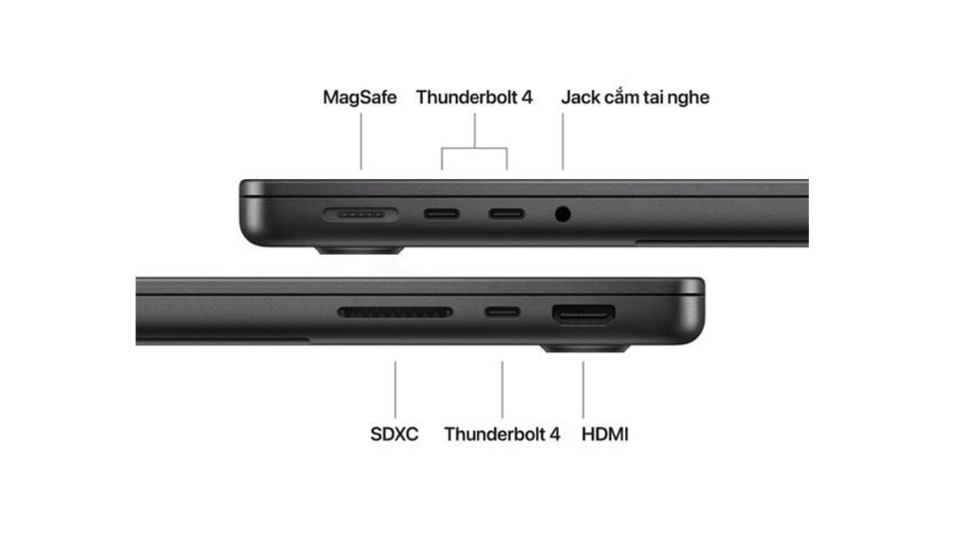 Khe thẻ nhớ SDXC, Cổng HDMI, Jack cắm tai nghe 3,5 mm, Cổng MagSafe 3, Ba cổng Thunderbolt 4 (USB‑C) hỗ trợ Sạc, DisplayPort, Thunderbolt 4 (lên đến 40Gb/s), USB 4 (lên đến 40Gb/s) |