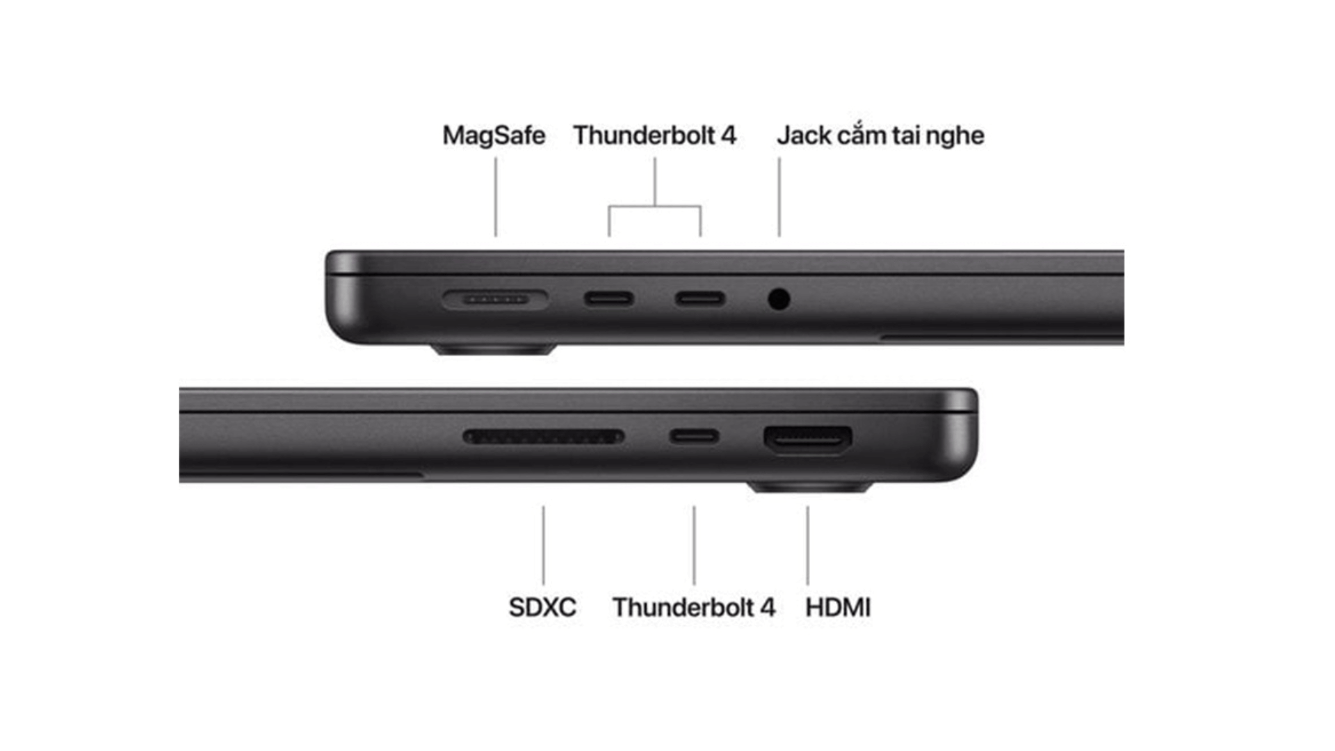 Khe thẻ nhớ SDXC, Cổng HDMI, Jack cắm tai nghe 3,5 mm, Cổng MagSafe 3, Ba cổng Thunderbolt 4 (USB‑C) hỗ trợ Sạc, DisplayPort, Thunderbolt 4 (lên đến 40Gb/s), USB 4 (lên đến 40Gb/s) |