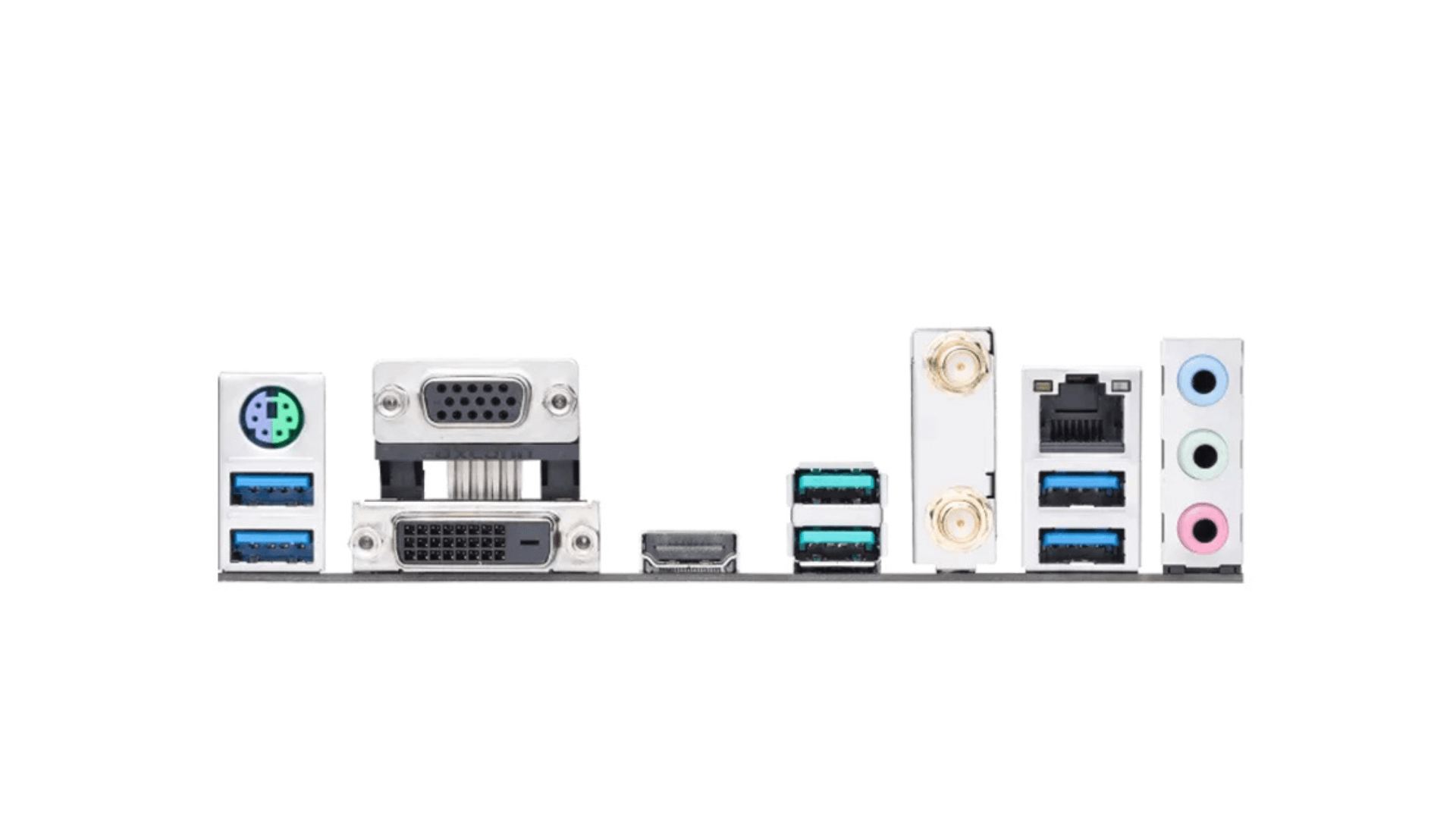 2 x USB 3.2 Gen 2 ports (2 x Type-A) 4 x USB 3.2 Gen 1 ports (4 x Type-A) 1 x D-Sub port 1 x DVI-D port 1 x HDMI® port 1 x Wi-Fi Module 1 x Realtek 1Gb Ethernet port 3 x Audio jacks 1 x PS/2 Keyboard/Mouse combo port |