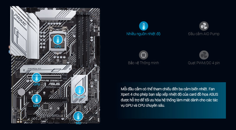 Mainboard ASUS PRIME Z590-P/CSM sở hữu khả năng điều khiển làm mát toàn diện có thể thiết lập cấu hình bằng phần mềm Fan Xpert 4 hoặc qua UEFI BIOS.