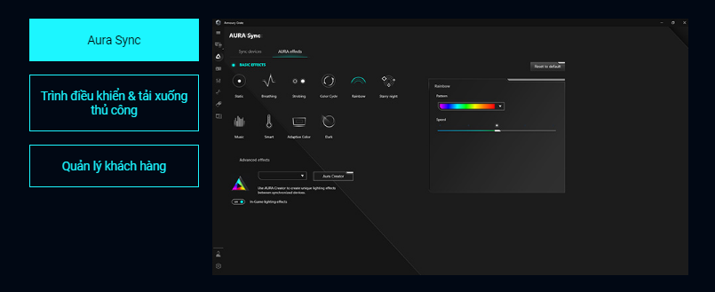 Armory Crate là một phần mềm tiện ích mới được thiết kế để cung cấp cho bạn quyền kiểm soát tập trung các sản phẩm được hỗ trợ. Từ một giao diện trực quan duy nhất, Armory Crate cho phép bạn dễ dàng tùy chỉnh hiệu ứng và ánh sáng RGB cho mọi thiết bị tương thích trong kho vũ khí của bạn. Phần mềm này cũng có thể áp dụng để điều chỉnh cho các sản phẩm mới ra mắt sau này của ASUS, bao gồm các mẫu bàn phím và chuột. Armory Crate thậm chí còn có tính năng lưu thông tin sản phẩm và cập nhật tin tức liên quan giúp bạn giữ liên lạc với cộng đồng ASUS.
