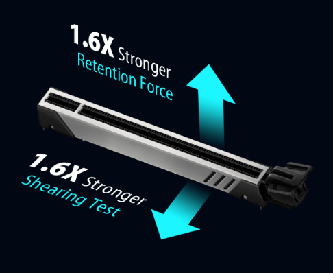 SafeSlot Core+ là khe cắm PCle độc quyền của ASUS được gia cường bởi giằng bằng thép không gỉ liền khối có chức năng che chắn khe cắm để bảo vệ khe cắm khỏi bị hỏng hóc. Nắp kim loại được cố định chặt vào khe cắm bằng các móc và toàn bộ cụm được cố định vào PCB bằng các điểm hàn gia cường để tạo ra một nền tảng chắc chắn cho những card đồ họa nặng.