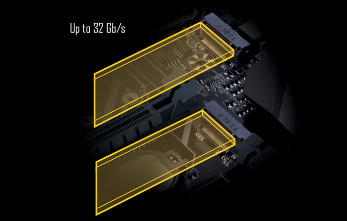 Với hai khe M.2 hỗ trợ chuẩn NVMe PCIe 3.0 x4, GIGABYTE mang đến cho người dùng kết nối dành riêng cho các ổ SSD chuẩn PCI-Express. PCIe 3.0 có tốc độ truyền dữ liệu lên tới 32 Gb/s cho mỗi cổng, cả hai khe M.2 cung cấp giải pháp lưu trữ lý tưởng vì chúng đều hỗ trợ các chế độ RAID.