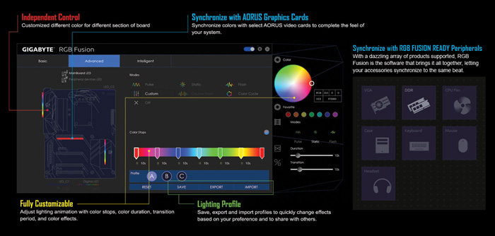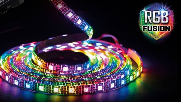 Với phần mềm RGB Fusion hoàn toàn mới giúp người dùng truy cập tới những cấu hình khác nhau về màu sắc, ánh sáng đã được lập trình sẵn. Bạn thậm chí còn có thể cài đặt đèn LED nhấp nháy theo những bản nhạc ưa thích hay thay đổi màu sắc theo nhiệt độ của CPU. Chế độ cao cấp (Advanced Mode) có thể xem là chuyên gia thực thụ về ánh sáng, vì nó hoàn toàn có thể tùy biến hiệu ứng chuyển màu cho những khu vực riêng lẻ, cùng với khoảng thời gian chỉ định và thời gian dịch chuyển.