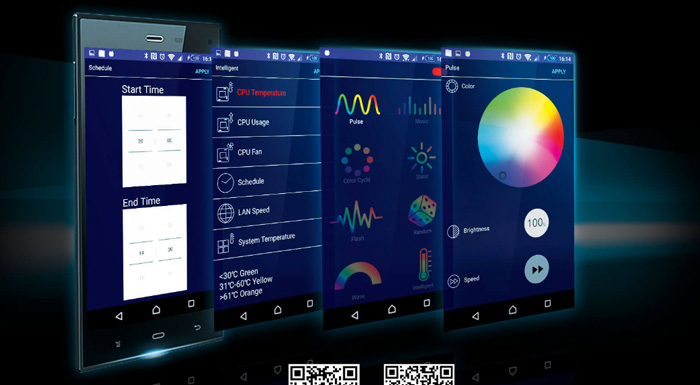 Đừng tỏa sáng chiếc máy tính, mà hãy biến nó thành sàn biểu diễn "ánh sáng nghệ thuật”. Với ứng dụng di động GIGABYTE RGB Fusion, người dùng có thể xem khi điều khiển dàn đèn của máy. Ứng dụng này cho phép dễ dàng truy cập, thử, điều chỉnh màu sắc và tốc độ của những chế độ khác nhau mà không cần phải đụng đến bàn phím và màn hình của máy tính.