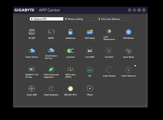 GIGABYTE App Center giúp bạn dễ dàng truy cập đến các ứng dụng của GIGABYTE nhằm hỗ trợ bo mạch chủ. Ứng dụng có giao diện người dùng thống nhất và đơn giản cho phép truy xuất đến tất cả các ứng dụng GIGABYTE đã cài đặt trên hệ thống, kiểm tra các bản cập nhật, và tải về ứng dụng, driver và BIOS mới nhất.