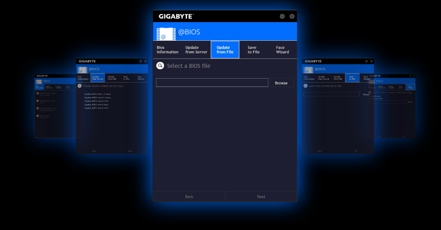 Ứng dụng GIGABYTE @BIOS cho phép bạn cập nhật BIOS của hệ thống ngay trong Windows bằng một giao diện đồ họa đơn giản và trực quan. @BIOS có thể tự động tải về phiên bản mới nhất từ các máy chủ của GIGABYTE hoặc bạn có thể cập nhật BIOS từ một file đã tải về sẵn trên máy. @BIOS cũng cho phép lưu lại bản BIOS hiện tại, phục hồi BIOS từ bản đã sao lưu trước đó.