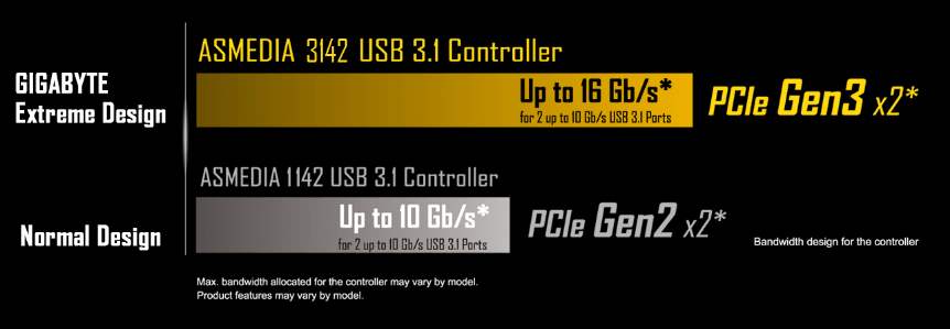 Chip điều khiển USB 3.1 ASMEDIA 3142 sử dụng 2 lane PCIe 3.0 có tốc độ lên đến 16 Gb/s, có nghĩa là bạn có thêm băng thông để kiểm soát hoàn toàn cổng USB 3.1 (10 Gb/giây). Giao thức USB 3.1 có băng thông cao gấp đôi so với thế hệ trước và khả năng tương thích ngược với USB 2.0 và 3.0. Giao thức USB 3.1 dùng chung cổng USB Type- A có nhiều cải tiến giúp tương thích rộng rãi nhiều thiết bị hơn.