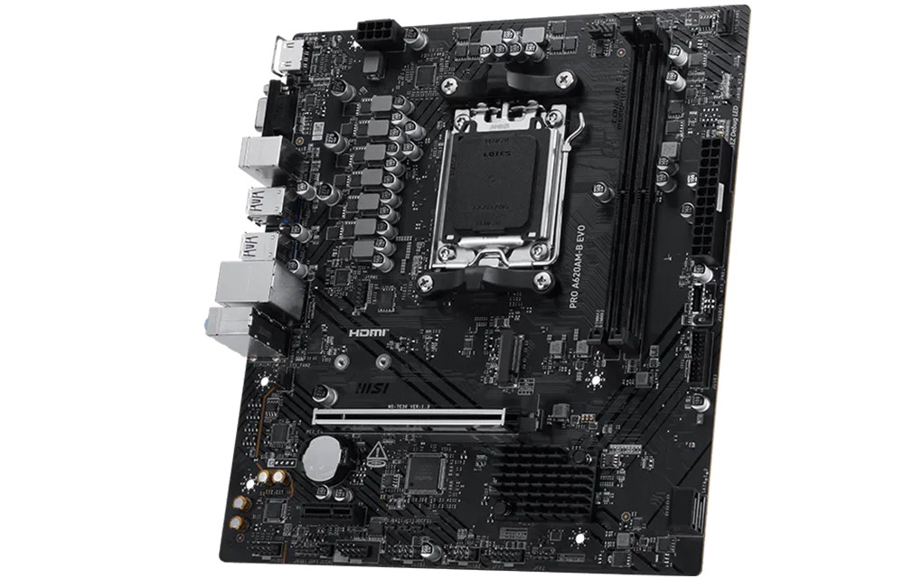 MSI PRO A620AM-B EVO sử dụng chipset AMD A620A, tương thích với các dòng CPU AMD Ryzen™ 9000, 8000 và 7000 Series. Khe PCIe x16 chính hỗ trợ băng thông linh hoạt: