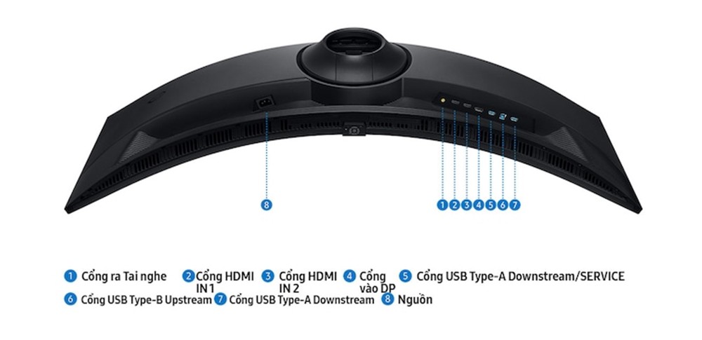 Samsung Odyssey G9 G91F được trang bị hệ thống cổng kết nối đa dạng, bao gồm 1 cổng DisplayPort 1.4, 2 cổng HDMI 2.1, cổng tai nghe, 1 cổng USB-B Upstream và 2 cổng USB Type-A Downstream 3.2 Gen1. Điều này giúp người dùng dễ dàng kết nối với PC, laptop, console thế hệ mới và các thiết bị ngoại vi khác. Màn hình cũng hỗ trợ chuẩn treo VESA 100x100mm, thuận tiện cho việc lắp đặt arm hoặc treo tường chuyên nghiệp.