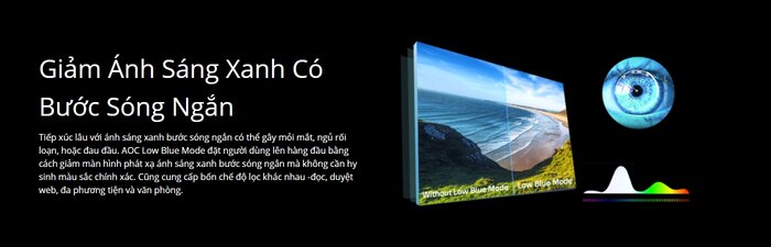 Để đảm bảo nhất cho sức khỏe đôi mắt, chiếc màn hình từ AOC còn được trang bị công nghệ độc quyền AOC Low Blue Mode, làm giảm phát thải lượng ánh sáng xanh từ màn hình có hại tới mắt mà không làm ảnh hưởng tới màu sắc hiển thị khi sử dụng.