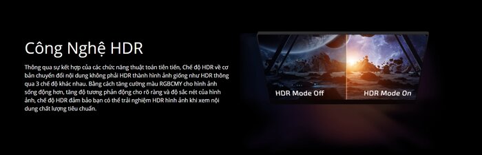Để mang lại trải nghiệm hình ảnh chân thực sống động nhất, chiếc màn hình AOC 27G2X được trang bị công nghệ HDR. Có thể tự động điều chỉnh màu hiển thị với 3 chế độ khác nhau, mang tới hình ảnh rõ ràng và sắc nét, mang tới trải nghiệm nội dung HDR với chất lượng tiêu chuẩn.
