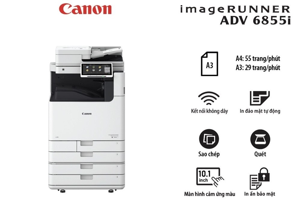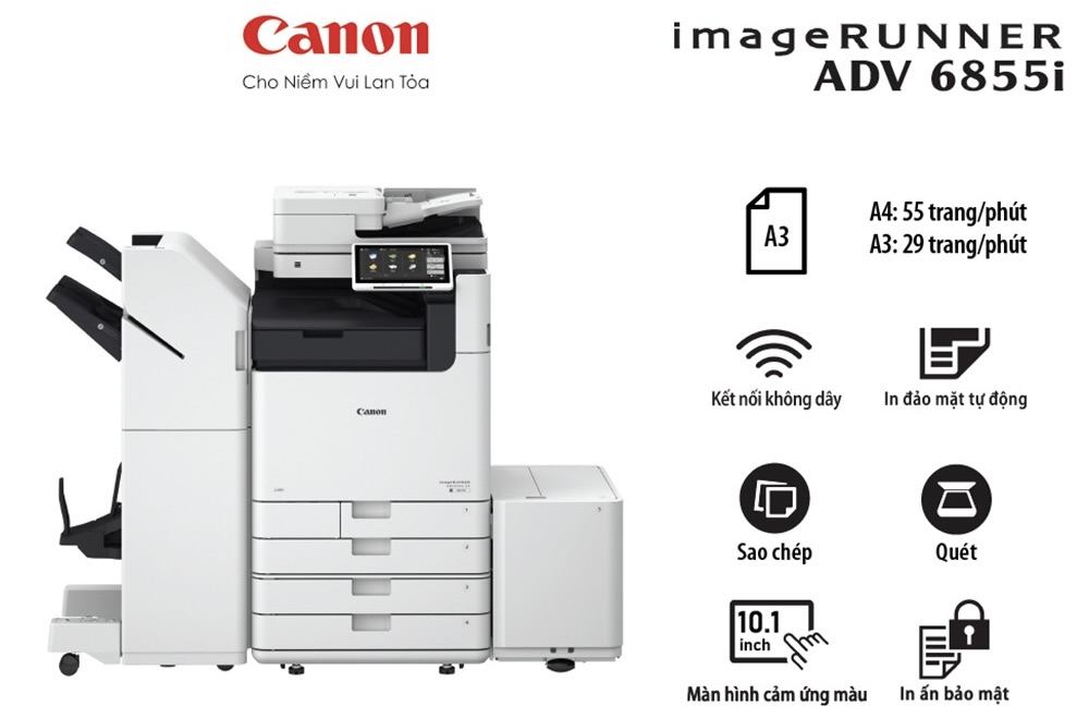 Với tốc độ in lên đến 55 trang/phút, hỗ trợ khổ giấy từ A6 đến A3, in đảo mặt tự động cùng khả năng hoàn thiện chuyên nghiệp, Canon iR-ADV DX 6855i đáp ứng tốt các yêu cầu khắt khe về năng suất, độ ổn định và chất lượng đầu ra.
