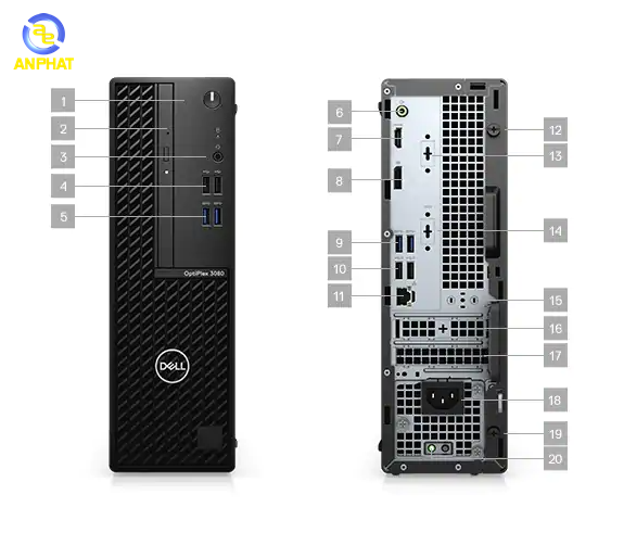 Ổ đĩa quang | Nút nguồn | Jack cắm âm thanh | Các cổng USB 2.0 (phía trước) | Cổng USB 3.2 Gen 1 loại A (phía trước) | Line-out | Cổng HDMI 1.4 | Displayort 1.4 | Cổng kết nối video: DP 1.4/ HDMI 2.0b / VGA | Cổng USB 3.2 Gen 1 Type-A (phía sau) (2) | Cổng USB 2.0 có Bật nguồn thông minh (phía sau) (2) | Thumbscrew | Cổng nối tiếp / PS2 tùy chọn | Cổng RJ-45 10/100/1000 Mbps | Khe cắm PCIe x 1 | Khe cắm PCIe x 1 | Khe cắm PCIe x 16 | Kết nối nguồn | Thumbscrew | Giắc cắm Antenna không dây bên ngoài | Đèn báo nguồn