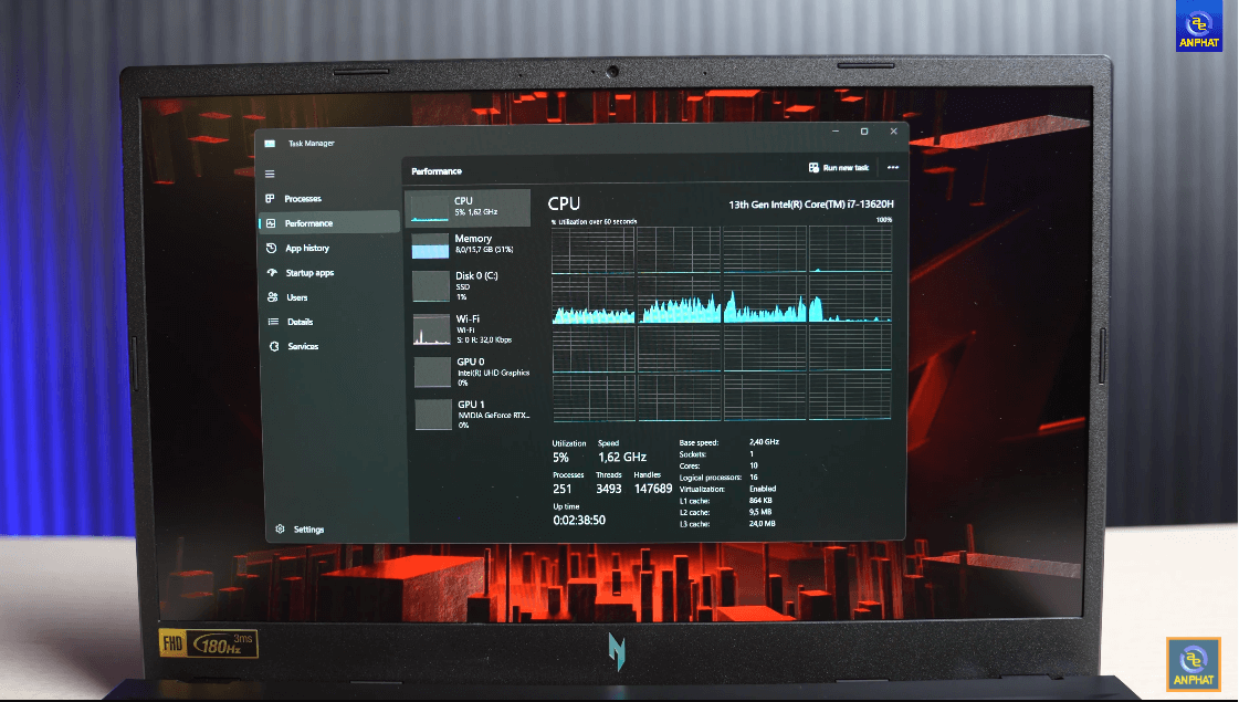 CPU: Intel Core i7-13620H (10 nhân: 6 nhân Performance + 4 nhân Efficient), boost lên tới ~4.9 GHz.