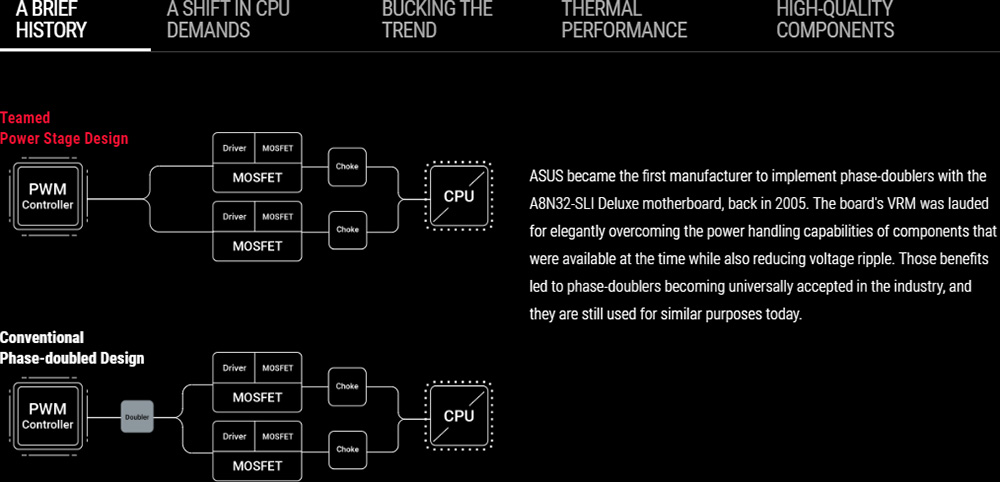** ASUS đã trở thành nhà sản xuất đầu tiên triển khai bộ nhân đôi pha với bo mạch chủ A8N32-SLI Deluxe vào năm 2005. VRM của bo mạch được ca ngợi vì đã khắc phục một cách khéo léo khả năng xử lý điện năng của các linh kiện hiện có vào thời điểm đó, đồng thời giảm hiện tượng gợn sóng điện áp. Những lợi ích đó đã khiến bộ nhân đôi pha được chấp nhận rộng rãi trong ngành và ngày nay chúng vẫn được sử dụng cho các mục đích tương tự.