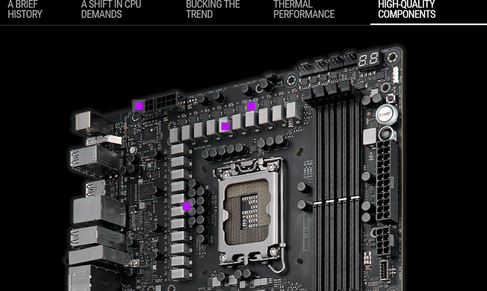 Kiến trúc ROG VRM mới nhất vượt qua thách thức bằng cách sử dụng các giai đoạn công suất được kết hợp để xoay chuyển dòng điện nhanh chóng, đồng thời duy trì hiệu suất nhiệt mẫu mực.