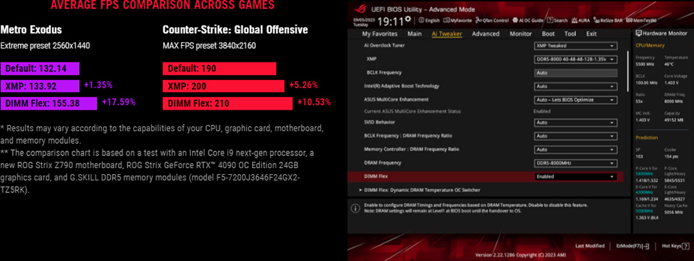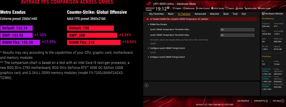 DIMM Flex cung cấp cho những người đam mê một phương pháp mới mạnh mẽ để ép xung các mô-đun bộ nhớ DDR5 của họ. Nó sử dụng mạch điện chuyên dụng có thể tăng hiệu suất hoặc giải quyết các vấn đề tiềm ẩn về độ ổn định, tùy thuộc vào chỉ số nhiệt độ. Khi nhiệt độ ở mức danh nghĩa, nó có thể sử dụng khoảng không bổ sung để tăng tốc độ và hiệu quả. Và khi nhiệt độ tăng lên, nó có thể điều chỉnh hành vi bộ nhớ đi xuống để duy trì sự ổn định.
