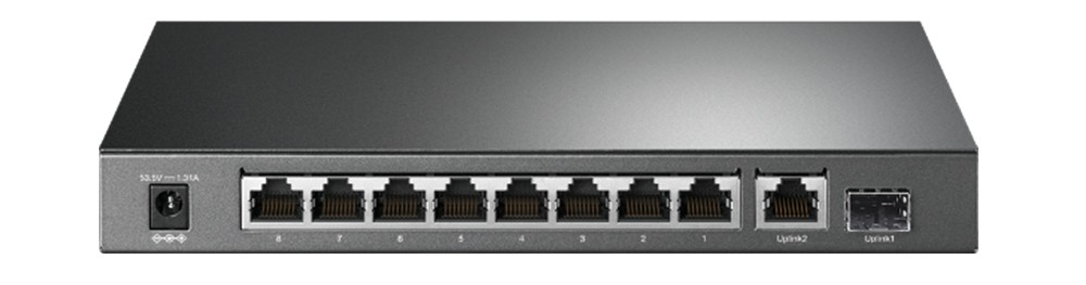 TL-SG1210P được trang bị 10 cổng Gigabit, bao gồm 8 cổng RJ45 hỗ trợ PoE+ chuẩn IEEE 802.3af/at, 1 cổng Gigabit RJ45 uplink và 1 khe cắm SFP Gigabit. Tổng công suất PoE lên đến 63W, cho phép cấp nguồn đồng thời cho nhiều thiết bị như camera IP, access point WiFi, điện thoại VoIP mà không cần adapter rời.