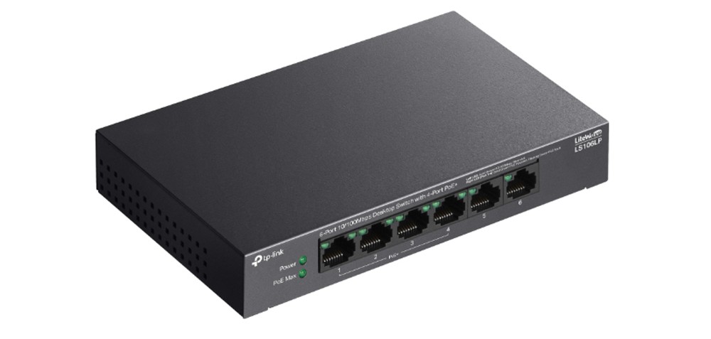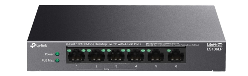 Switch TP-Link LS106LP được trang bị 6 cổng RJ45 tốc độ 10/100Mbps, cho phép kết nối nhiều thiết bị mạng khác nhau như máy tính, đầu ghi camera, router, access point hoặc các thiết bị mạng khác.