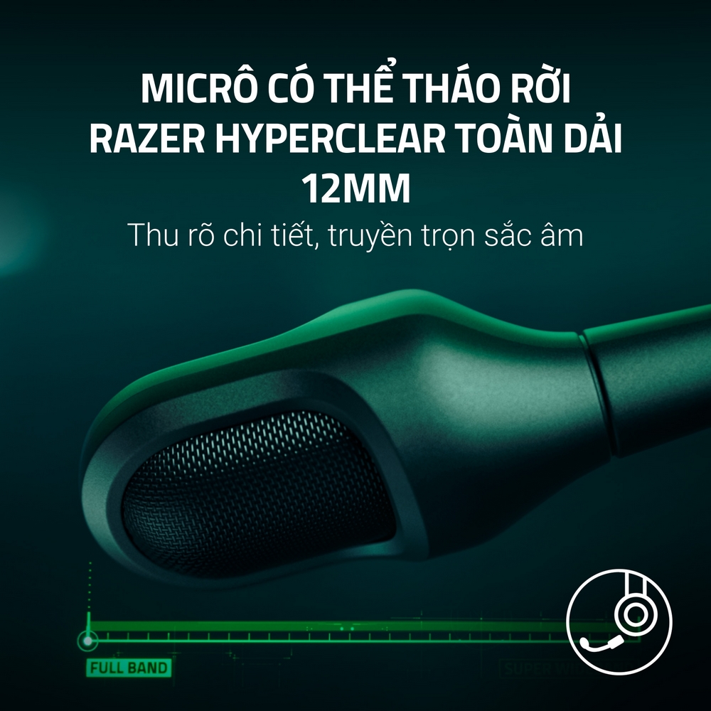 Razer trang bị cho BlackShark V3 Pro micro HyperClear Full-Band đường kính 12mm, hỗ trợ thu âm với sample rate 48kHz, mang lại âm giọng rõ ràng, tự nhiên và chi tiết cao. Micro dạng cardioid giúp tập trung thu âm từ phía trước, loại bỏ hiệu quả tiếng ồn phía sau và hai bên. Đây là thiết kế lý tưởng cho các buổi thi đấu, giao tiếp nhóm trong game hoặc livestream chuyên nghiệp. Micro có thể tháo rời dễ dàng khi không sử dụng.