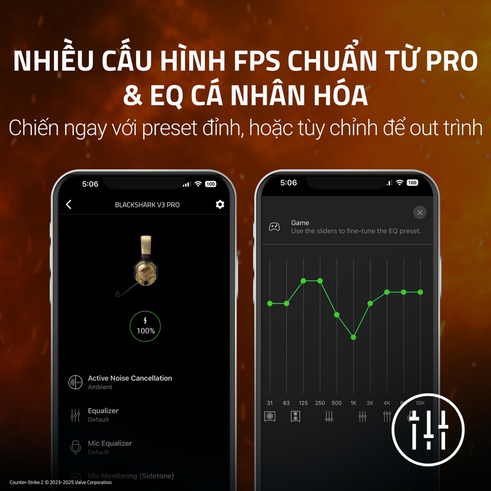 Razer BlackShark V3 Pro cho phép bạn tùy chỉnh âm thanh chi tiết thông qua phần mềm Razer Synapse trên máy tính và ứng dụng Razer Audio App trên thiết bị di động. Sản phẩm hỗ trợ các profile EQ chuyên biệt cho từng dòng game như FPS, RPG, MOBA hoặc chế độ nghe nhạc, giúp tối ưu âm thanh theo đúng nhu cầu sử dụng. Người dùng cũng có thể lưu cấu hình tùy chọn cá nhân để sử dụng trên nhiều thiết bị khác nhau một cách linh hoạt.