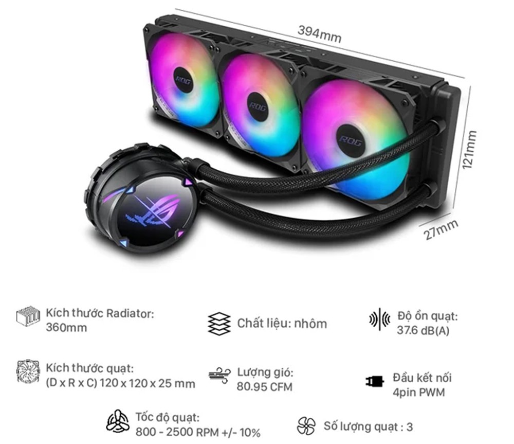 | Phụ kiện | 3 x Quạt Radiator 120 mm ARGB 1 x cáp USB để điều khiển phần mềm 1 x cáp chia ARGB 1 sang 4 1 x Gói Phụ Kiện Ốc Vít và Giá Đỡ 1 x Hướng Dẫn Sử Dụng Nhanh 1 x Sticker ROG |