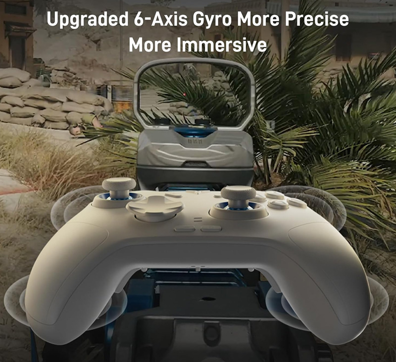 FLYDIGI Direwolf 4 được tích hợp cảm biến chuyển động 6 trục (Gyro), cho phép hỗ trợ điều khiển chuyển động trong các tựa game tương thích. Tính năng này đặc biệt phù hợp khi chơi game trên Nintendo Switch hoặc các game hành động yêu cầu thao tác nghiêng, xoay tay cầm để điều khiển.