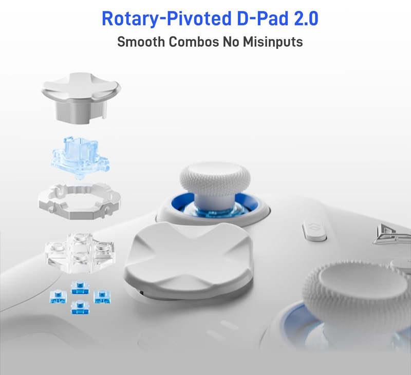Một trong những điểm nổi bật nhất của FLYDIGI Direwolf 4 chính là joystick sử dụng công nghệ Hall Effect. Joystick này có lực nhấn trong khoảng 40–80gF, mang lại cảm giác điều khiển mượt, chính xác và đồng đều. Công nghệ Hall Effect giúp loại bỏ hiện tượng drift thường gặp trên joystick truyền thống, đồng thời tăng độ bền khi sử dụng lâu dài.