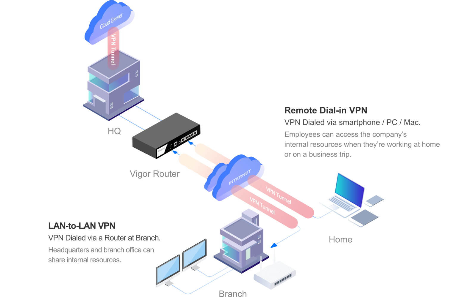 Thiết bị còn là trung tâm VPN chuyên nghiệp, hỗ trợ 50 kênh VPN Server với đầy đủ giao thức như PPTP, L2TP, IPsec (IKEv1, IKEv2), SSL VPN, OpenVPN, trong đó SSL VPN & OpenVPN lên đến 25 kênh, đáp ứng tốt nhu cầu kết nối chi nhánh, làm việc từ xa và triển khai hệ thống mạng đa site. Hiệu suất VPN ấn tượng với IPsec đạt 290Mbps và SSL VPN đạt 120Mbps, đảm bảo truyền dữ liệu an toàn nhưng vẫn mượt mà.