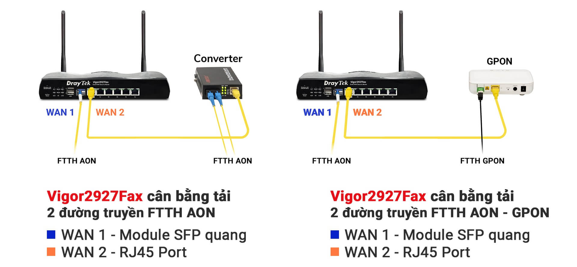 WAN 1: Cổng quang SFP 1.25Gbps, hỗ trợ 1 hoặc 2 sợi quang