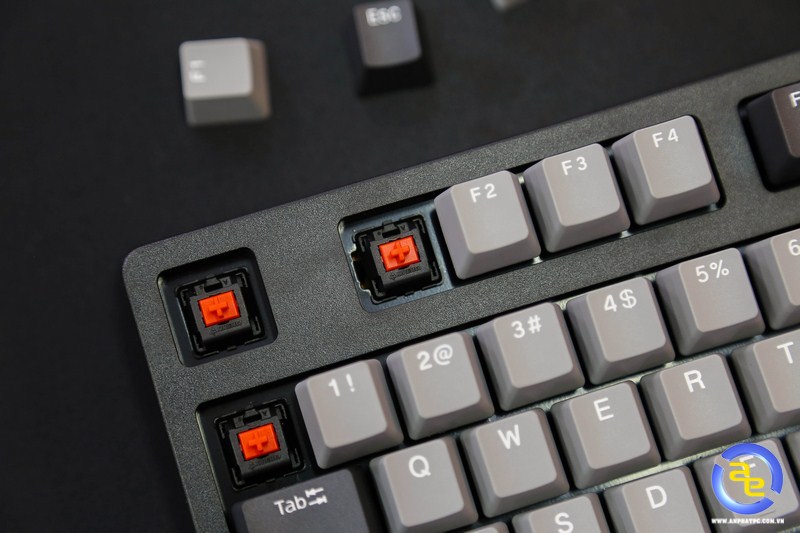 Tháo lớp keycaps PBT Double Shot của phím ra, chúng ta có thể thấy ngay switch sử dụng trên phím 100% là Cherry MX (made in Germany), đặc biệt hơn E-Dra EK387 Pro Cherry đã được nhà sản xuất "lube" (bôi trơn switch và stabilizer) cho cảm giác bấm cực kỳ tốt và cân bằng. Đây là một chi tiết cho thấy rằng đây là sản phẩm mà hãng cực kỳ tâm huyết.