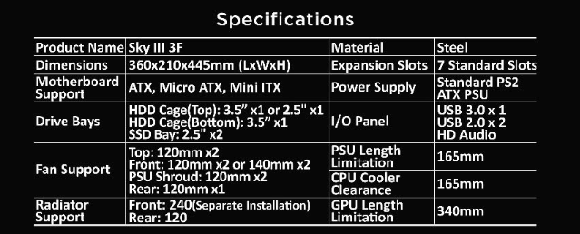 Vật liệu: Steel Kích thước: 360 x 210 x 445 mm Hỗ trợ: 2.5 "" x 1 / 3.5"" x 1 Khe mở rộng: 4 slots Hỗ trợ Mainboard: ATX, Micro ATX, Mini ITX Cổng kết nối: USB3.0 x 1 - USB2.0 x2 - Audio in/out x 1 (HD Audio) Hỗ trợ tản nhiệt CPU 165mm Hỗ trợ VGA 340mm 2 MẶT KÍNH CƯỜNG LỰC (HÔNG TRÁI) FAN HỆ THỐNG - Trước: 120mm x 2 (lắp sẵn) hoặc 140mm fan x 2 (tùy chọn) Sau: 120mm fan x 1 (lắp sẵn) Nóc: 120mm fan x 2 (tùy chọn)